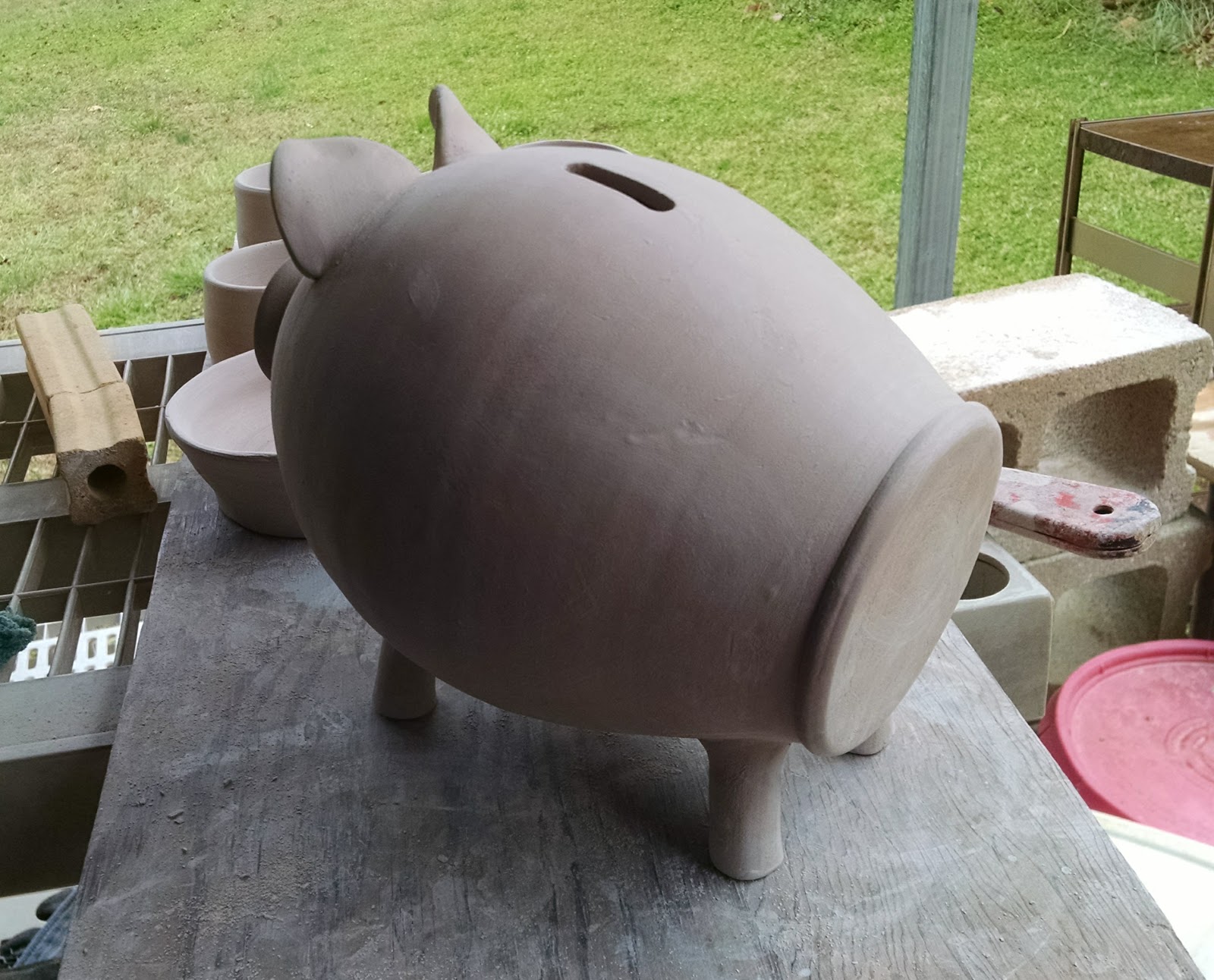 The problematic part of making larger piggy banks is that you can’t stand them on all fours until the legs have stiffened some. I typically put legs on a few then let them rest on their butts for any where from a half hour to an hour, depending on humidity. The trick is not to forget about them before it’s too late to make leg adjustment. I try to get them as wobble free as possible.