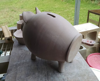 Late yesterday I finished this round of salt pigs, piggy banks, and big piggy banks. I think when all was said and done there was around forty. It seemed like it took forever to get them completed. Our studio has been very humid and I did a lot of shuffling them around, covering, and uncovering to get them to, and keep them at, a workable state.