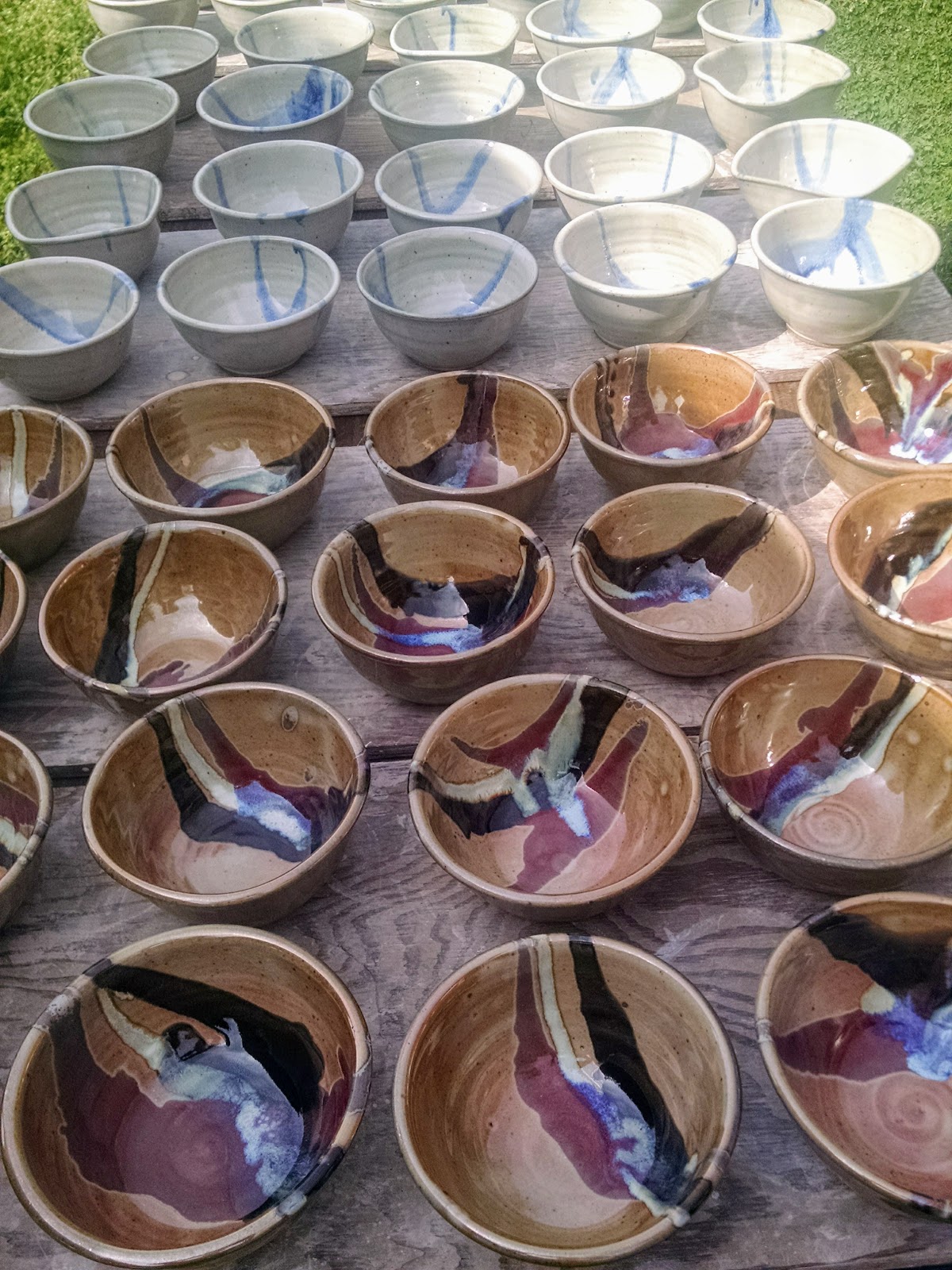 I was up early this morning and unloaded the kiln before Jeff even got out of bed. It went quickly because he had un-bricked the door last night. It was a really good firing with a variety of work from piggy banks, sugar & creamers, mugs, and our 50+ bowls for the Empty Bowls event next week.