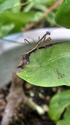 I promised a blog post about my small jars when they came out of the kiln, but I am going to wait until the last couple come out of glaze firing we did this weekend. In the meantime in between making pots, we have been spending many evenings working on our yard and gardens. We have been have a problem with bugs eating our basil and the leaves of our cone flowers. We spray with an all natural bug repellent and have had mixed results. I decided that what we needed were praying mantis!