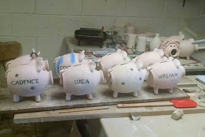 I had mixed results with the first little boxes to be glaze fired. I will post about those as soon as all the piggy banks are packed and shipped. I think I have been wearing a path from here to the post office!