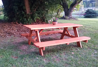 I had it in my head for some time now, that I wanted a picnic table in the front yard. A place for pottery guests to rest or even have a picnic. As many know, dining in Seagrove is rather limited, but when the weather is good it’s a beautiful area to picnic. We bought a picnic table kit from Lowe’s. The price was right but it needed some elbow grease. Lots of sanding and then a coat of weather seal before assembling. When we were finished, we realized the seats are too low. The pre-drilled holes were an inch lower than they were supposed to be. Even with the extra inch the height would not have been great. Jeff is going to take it apart and drill new holes.