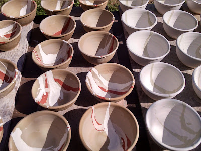 Jeff did the all of the glaze trailing. Half are “nuka” glaze with blue and green trailing, the other half are shino with copper red. We were really happy that we had a bright sunny day to work outside.