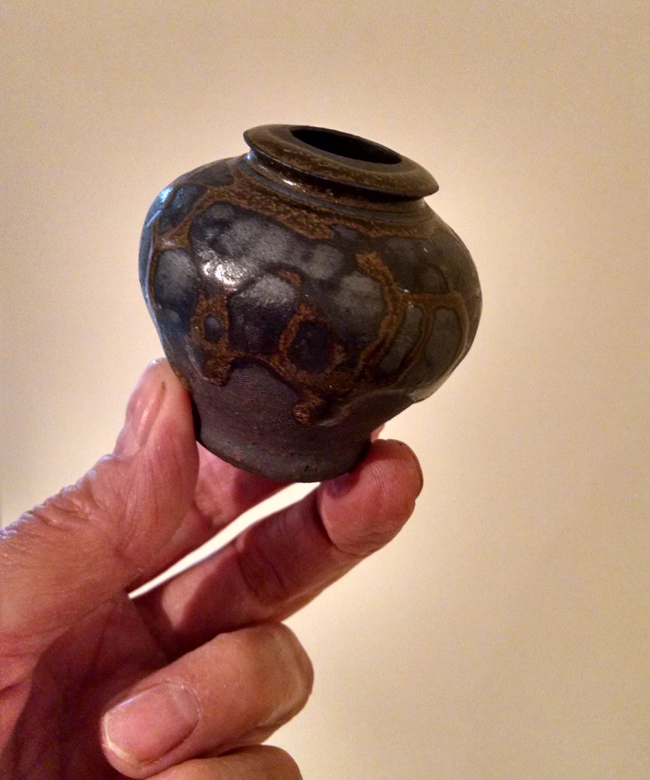 Jeff threw a mini pot on the wheel using our “505 Clay”, dug in our own backyard. Ash glazed and fired to cone 10 in the gas kiln.