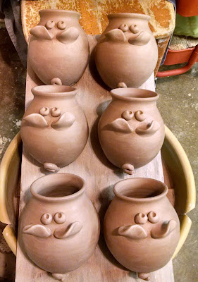 Late yesterday I finished this round of salt pigs, piggy banks, and big piggy banks. I think when all was said and done there was around forty. It seemed like it took forever to get them completed. Our studio has been very humid and I did a lot of shuffling them around, covering, and uncovering to get them to, and keep them at, a workable state.