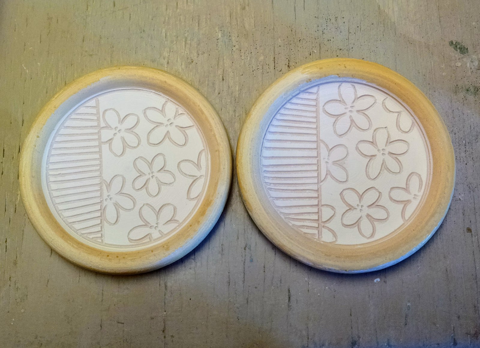 When the holiday rush was over I found two coasters that were forgotten. They were wrapped in plastic and still leather hard. I had been trying to talk myself into braving the cold studio and getting some work done. Opportunity was calling my name! I got out there, applied some slip and once they were dry enough, carved a design. I was so proud of myself for finally getting something done. Jeff laughed because there were only two, and I wimped out with a simple design. Cut me some slack… it was really cold in the studio!
