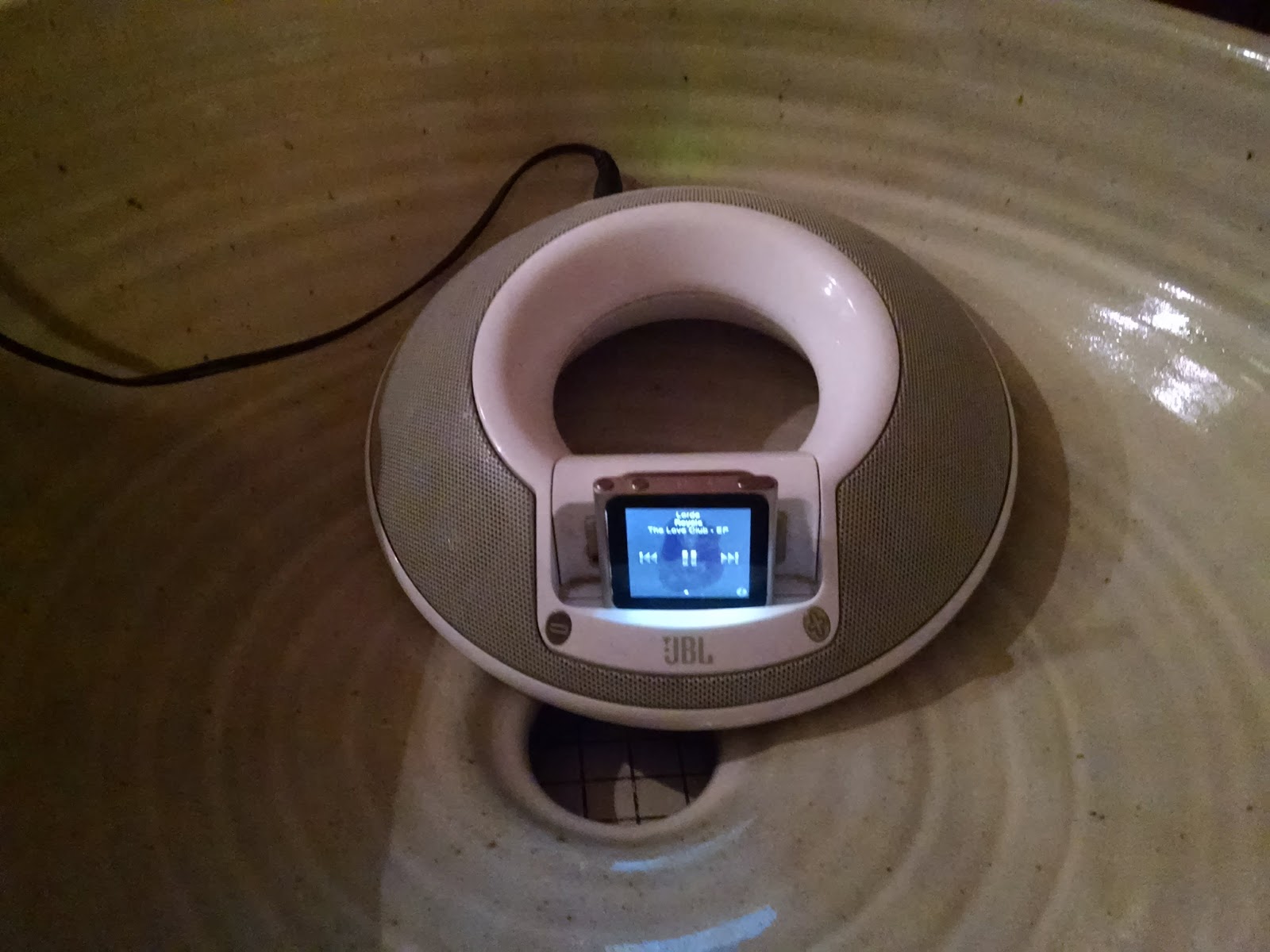 Occasionally I pop my iPod nano into my old speaker dock and play it while I am cooking dinner. The speakers aren’t the greatest and since Jeff had a vessel sink on the counter, waiting to be shipped, I decided to set my speaker dock inside it for a better sound. Low and behold it worked great!